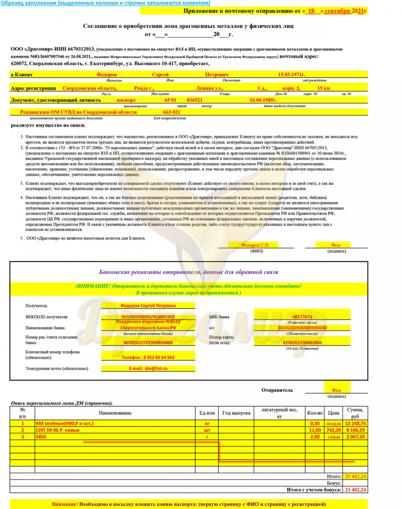 • в день получения посылки на почте или в транспортной компании заполняет акт вскрытия посылки и закупки сырья на основании вложенного соглашения и описи и с учетом цен на сырье текущего дня. Копии акта высылаются на электронную почту отправителя (после предварительного согласования с продавцом по телефону);